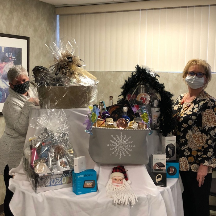Photo caption: (l to r) Hanscom FCU employees Judy Houle, member services representative, and Sheila Mavropoulos, member services liaison, stand with several of the possible prizes up for grabs in the holiday raffle.